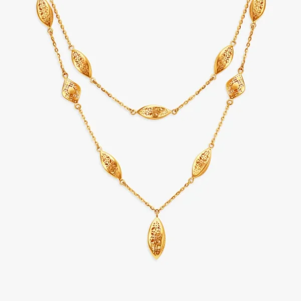 A knot pattern elegant Necklace with mesh finish links and dual layer crafted in yellow gold. Drawn from the world of knitted textures and intricate knots, this dual-layer necklace, featuring a captivating weave pattern, is the ideal complement for your wardrobe. It effortlessly enhances your casual ensembles and adds a touch of style to your off-duty looks!