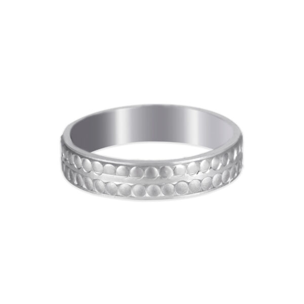 A striking combination of modern design and timeless platinum, these dual-tone dotted rings offer a versatile accessory for casual wear. The intricate dotted pattern, alternating between two tones, creates a visual depth that enhances the overall design. The smooth platinum finish adds a sleek, look, making these rings ideal for casual wear. Perfect for stacking or wearing solo, they are a versatile accessory that adds a refined touch to everyday outfits.