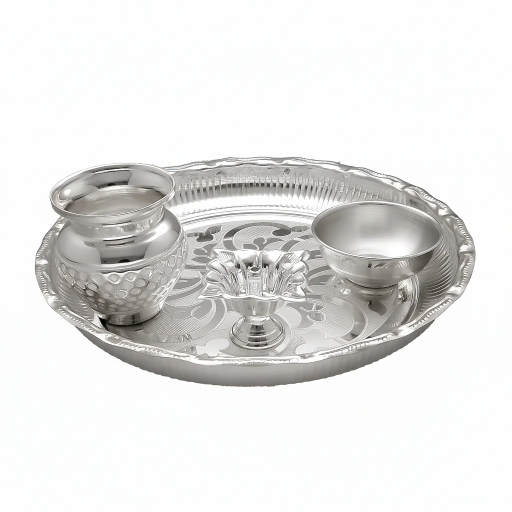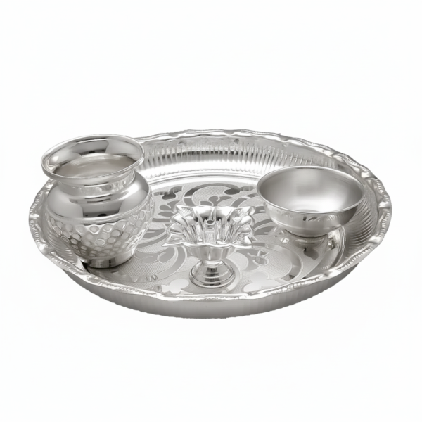 Elevate your dining experience with our Silver Thali Set, a masterpiece crafted by skilled artisans. This set includes a thali, katori, and other essential elements, adding a touch of sophistication to your meals. Explore our collection for more silver articles that showcase exceptional craftsmanship. Care Instructions: Preserve the brilliance of this silver thali set by avoiding contact with corrosive substances and regular polishing.