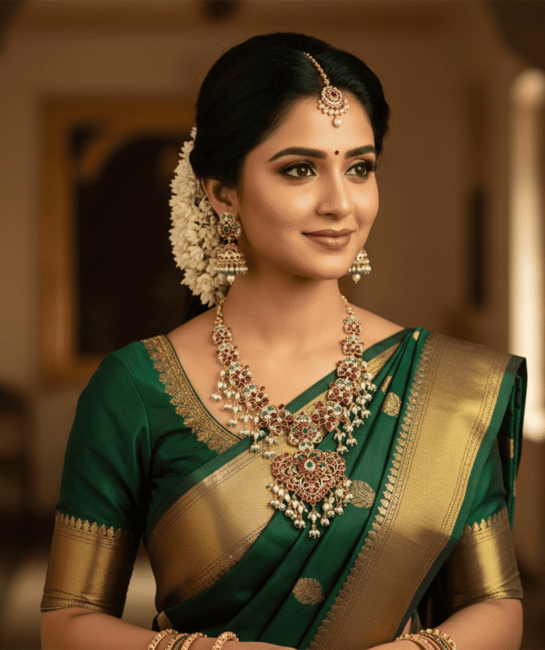 The Regal Bloom Diamond Necklace is a masterpiece of opulence, crafted in 18 Karat rose gold. This statement piece features an intricate floral arrangement of lush rubies and rich emeralds, accentuated by natural diamonds that enhance its regal charm. Cascading pearls add a finishing touch, lending a sense of movement and grace. Designed for those who appreciate grandeur, this necklace set is perfect for momentous occasions, exuding sophistication and timeless allure.