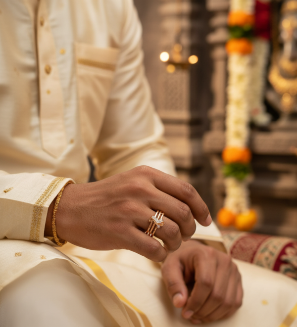 Invoke divine blessings with this yellow gold ring featuring a Ganapathi-inspired motif on triple bands, radiating grace with natural Diamond elegance. Carry the essence of Ganapathi with this natural diamond ring, beautifully detailed on a triple-band design, crafted to bless every wedding and spiritual ceremony with charm and faith.