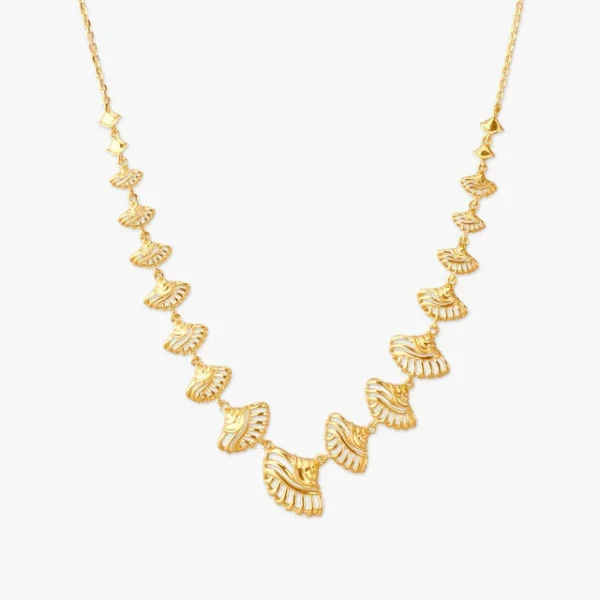 Add a breeze of style with this yellow gold Necklace designed with textured fan-shaped links in a rhythmic, sculpted silhouette.Make everyday styling effortlessly bold with this modern gold Necklace, perfect for gallery openings, brunch dates, or a day out in style.