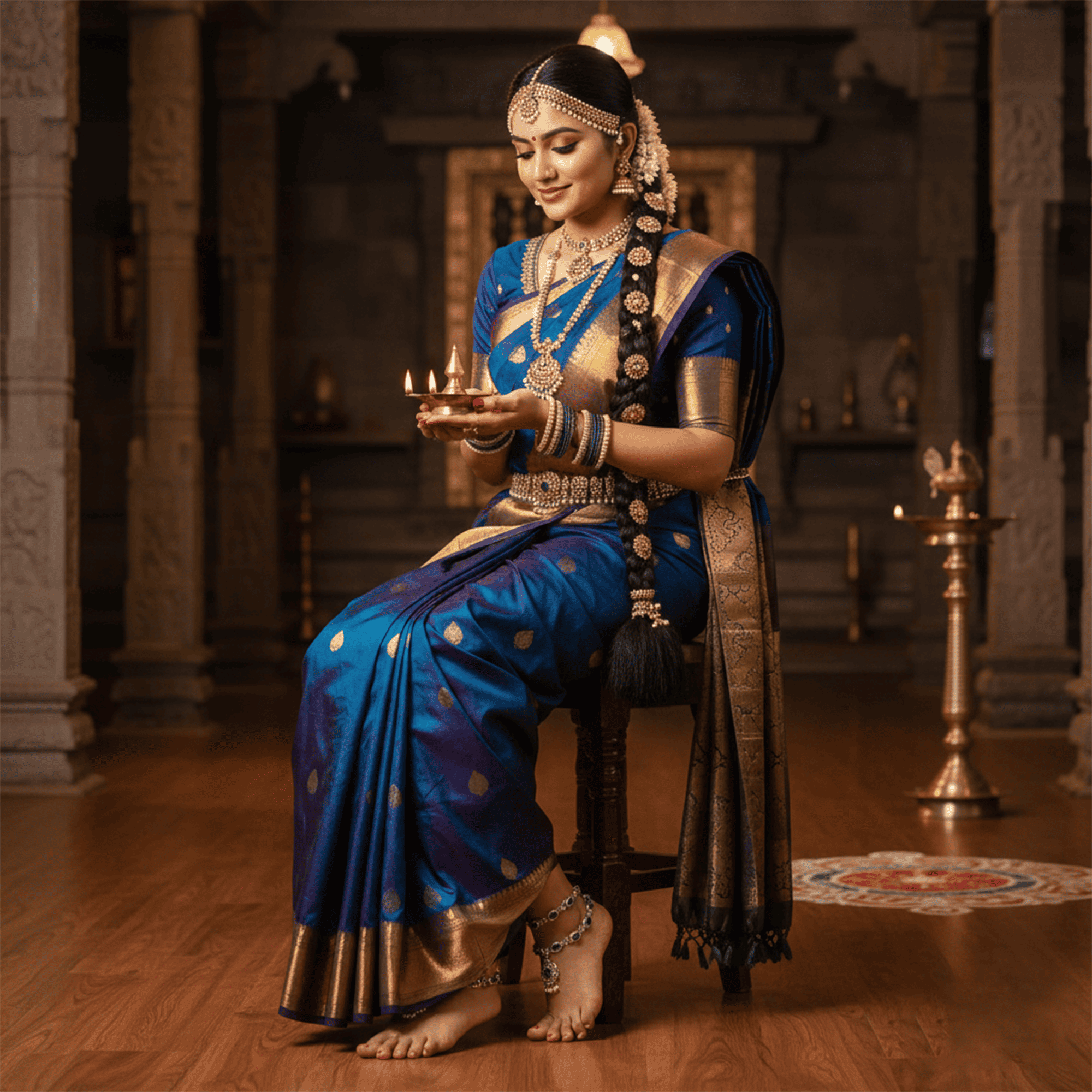 A breathtaking heirloom piece that captures divine South Indian heritage—this elaborate Temple Haram is crafted in an antique gold finish and features intricate Nakshi (sculptural) work of deities and temple motifs. The grand pendant showcases Goddess Lakshmi, flanked by traditional peacocks and embellished