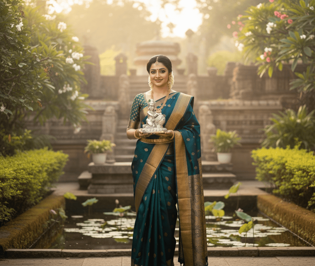 This exquisite pendant is a radiant tribute to Goddess Lakshmi, the Hindu deity of wealth, fortune, and prosperity. Crafted from pure gold, the design showcases the Goddess seated serenely on a magnificent lotus flower (Padma), which symbolizes purity, beauty, and divine power.
