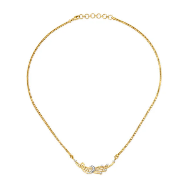 Don’t shy away from making a bold statement when you wear this feather-shaped necklace crafted in Yellow Gold. Stone Clarity VSThe strapping design of this Necklace, has been set in yellow gold, giving off a primal, rugged vibe.